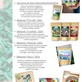 Retrouvez l’ensemble de nos produits à base de spiruline paysanne en brindilles sur notre page COMMANDER.
